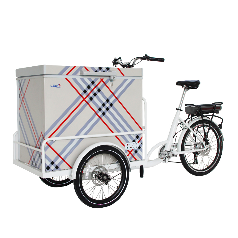 Nuevo diseño 500W eléctrico 3 ruedas helado bicicleta de carga Carro de bebidas con congelador Solar DC 258L para hacer helados